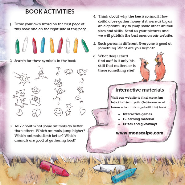 A story about a small lizard who falls from the wall and tries to get back. He gets help from ants, spider, birds, mice, and hare. Will he be able to climb the wall and get back to his family? A cute inspirational story that teaches children the importance of not giving up.